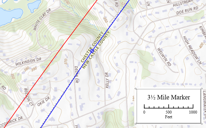 In this vicinity the new boundary (blue) was approximately 550 ft closer to New Castle than the 1701 line (red).