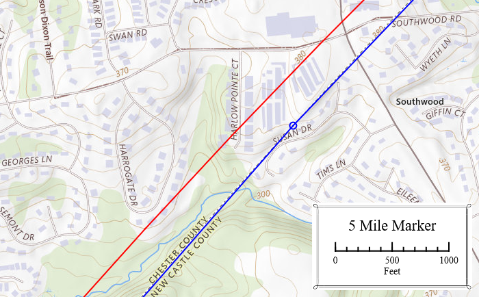 In this vicinity the new boundary (blue) was approximately 290 ft closer to New Castle than the 1701 line (red).