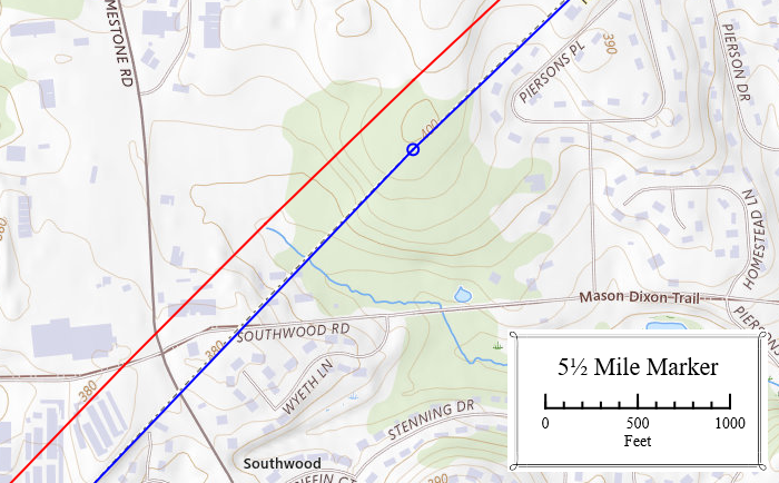 In this vicinity the new boundary (blue) was approximately 230 ft closer to New Castle than the 1701 line (red).
