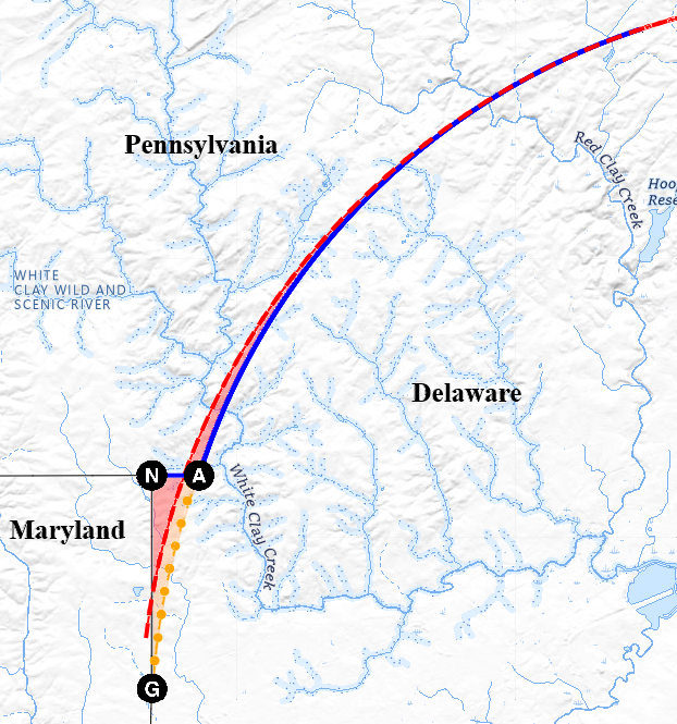 Starting from the southwest corner of Delaware, Mason and Dixon marked the northward Tangent Line (from the Middle Point [southwest corner] to the Tangent Point), the Arc Line, and the North Line, which ends at what is now the Tri-State Marker, the Northeast Corner of Maryland. West from that marker, on a line of latitude, they marked the West Line (sense 2), which they extended some 230 miles into the wilderness, not quite to the end of Pennsylvania’s southern boundary. (The surveying and initial, temporary marking of the West Line [sense 1] began from the Post mark’d West, not quite 3 miles east of the Tri-State Marker and the beginning of the Pennsylvania-Maryland line.)