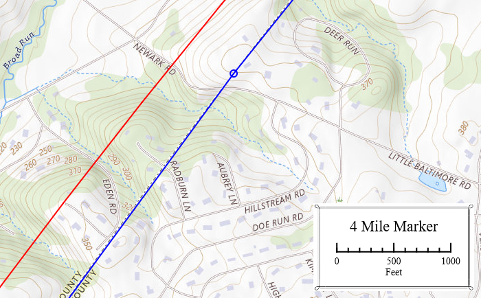 In this vicinity the new boundary (blue) was approximately 500 ft closer to New Castle than the 1701 line (red).