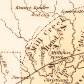 Penn’s combined colony was initially organized into six counties: Bucks, Philadelphia, and Chester (collectively the “Province of Pennsylvania”); and New Castle, Kent, and Sussex (collectively the “Lower Counties” or “Territories”). Chester County at that time extended from the Delaware River inland only as far west as the Brandywine with its southern border around Naaman’s Creek [1]. New Castle County extended inland far to the northwest and encompassed more than half of present-day Chester County. In these early years, the entire White Clay watershed was considered to be back-country New Castle County and patent and deed descriptions for tracts of land sold there gave the property location as “New Castle County” or “South of the Brandywine”.